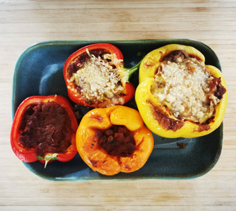 - Bak de gevulde paprika’s in de oven tot de buitenkant van de paprika een beetje geroosterd is